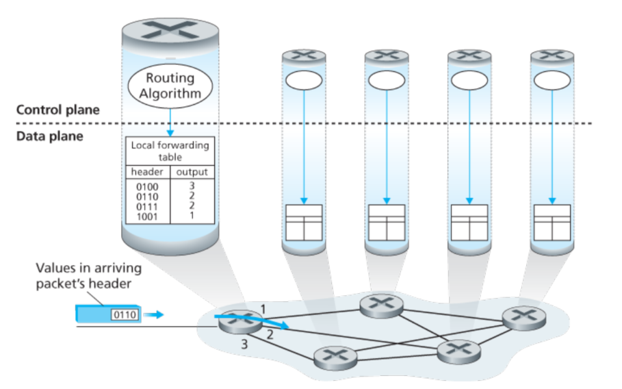 首先需要注意的是,和运输层协议不同的是,网络层在每一个router内都是存在的。对于数据层次来说,每个router都需要将先前链路的数据发送至输出接口的链路上;而对于控制层次来说,最主要的工作是协助这些当地的每个router的传送数据,确认相应的线路。