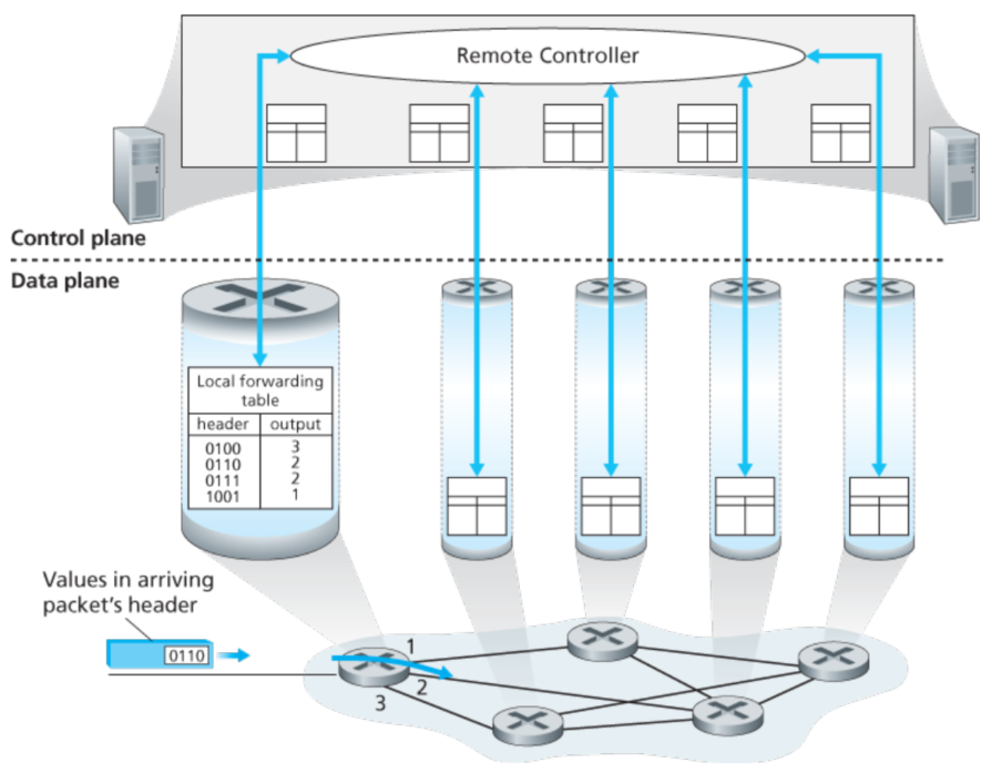 实际上一种更为广泛的方法,是通过远程的控制器计算更新forwarding table,如下面所示:
