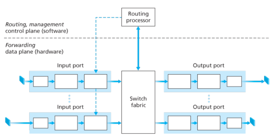 - 输入端口,将物理链路层接到路由器的物理层,这就是输入端口最左侧和输出端口最右侧的功能。输入端口扮演了链路层的功能,用来和链路进行交互,这是输入输出端口中间方框的功能。最重要的是查找的功能,这是输入端口最右侧的功能,通过查询转发表决定路由器的输出端口。包含有控制信息的包被转发给路由选择处理器进行下一步处理。