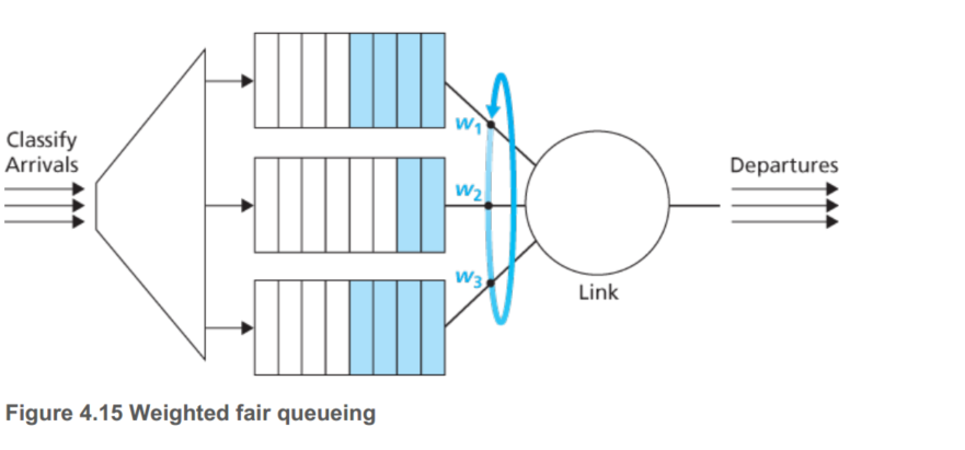 FIFO和优先队列(2个队列,一个优先级高)就不说了,下面说一下RR和WFQ,简单的RR算法和OS中的进程调度是一样的,一个广义上的RR队列是被称作WFQ(weighted fair queuing)如下图所示: