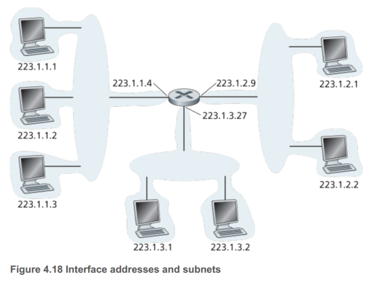 左侧24bit都是相同的,在这张图中用交互机就可以连接。这个IP分配可以表示为223.1.1.0/24, /24又被称为子网掩码,告知最左侧24bit定义了这个子网络。