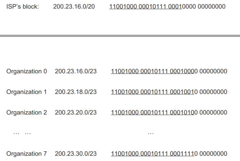 一个公司想得到一个IP地址,首先要和ISP对接,因为ISP拥有大量的IP地址。加入ISP拥有200.23.16.0/20,那么他可以分配比如8个地址: 200.23.16.0/23、200.23.18.0/23 ... 200.23.30.0/23,就像下面这个图所展示的那样。
