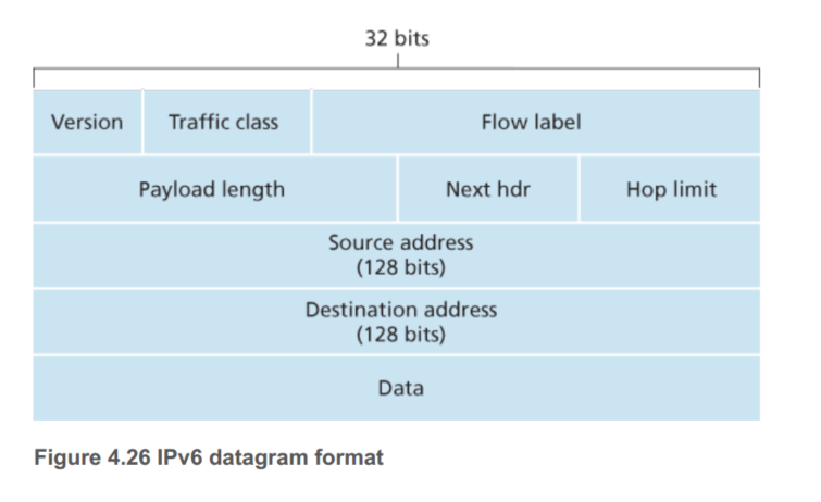 - next header: 告诉协议那部分要被传送(如TCP/UDP)和IPv4一样